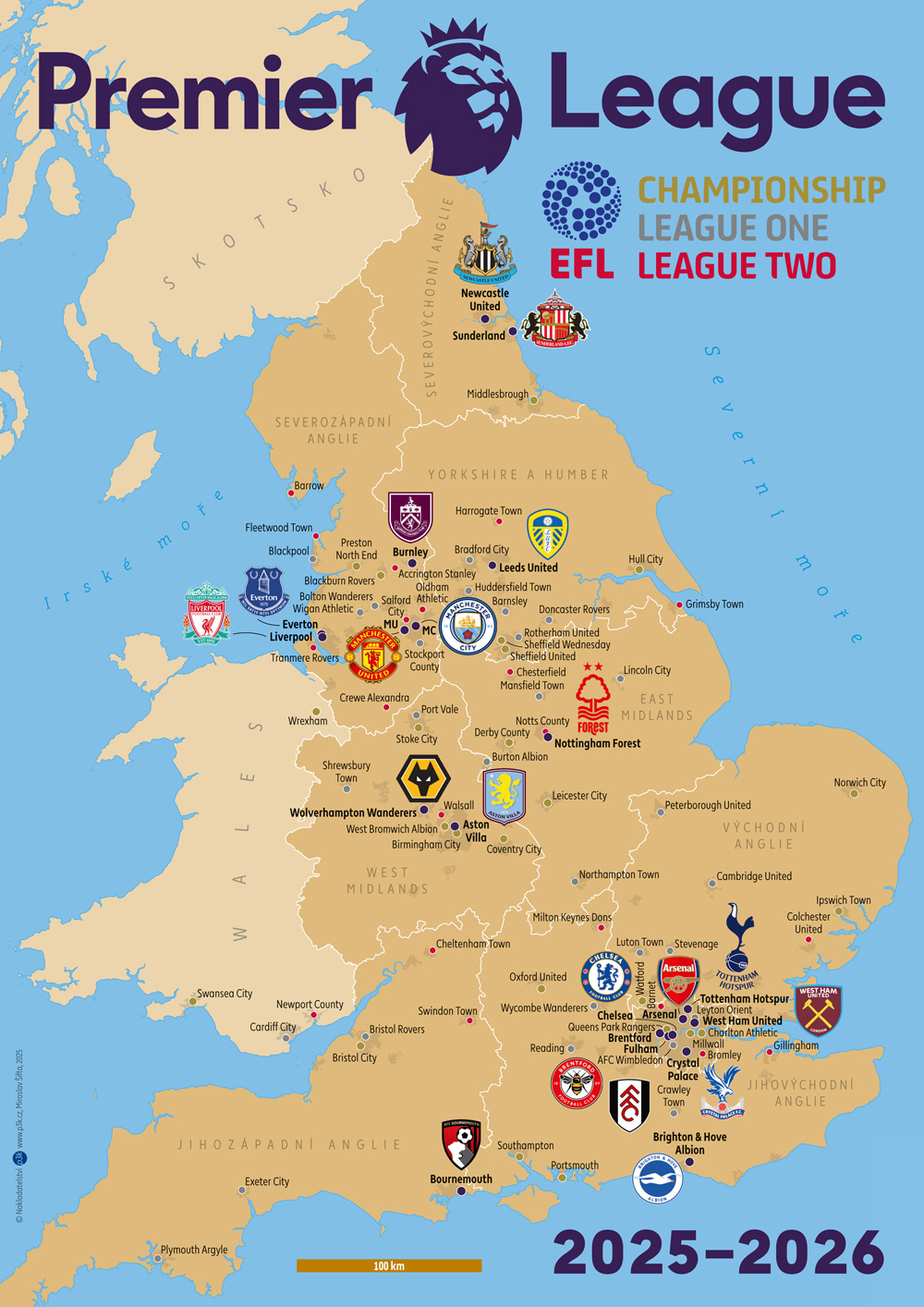 Elektronická verze (pdf) mapy anglického fotbalu (sezona 2025/2026). Zobrazuje kluby Premier League, Championshiop, League One a League Two, u klubů Premier League také znaky klubů. Na druhé straně pdf najdete tabulku historické úspěšnosti klubů v anglické prvoligové soutěži a mapové výřezy Londýna a severozápadní Anglie.