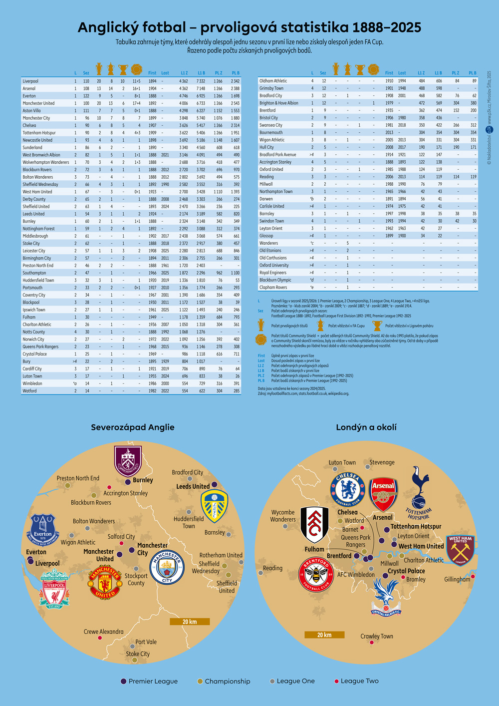 Elektronická verze (pdf) mapy anglického fotbalu (sezona 2025/2026). Zobrazuje kluby Premier League, Championshiop, League One a League Two, u klubů Premier League také znaky klubů. Na druhé straně pdf najdete tabulku historické úspěšnosti klubů v anglické prvoligové soutěži a mapové výřezy Londýna a severozápadní Anglie.